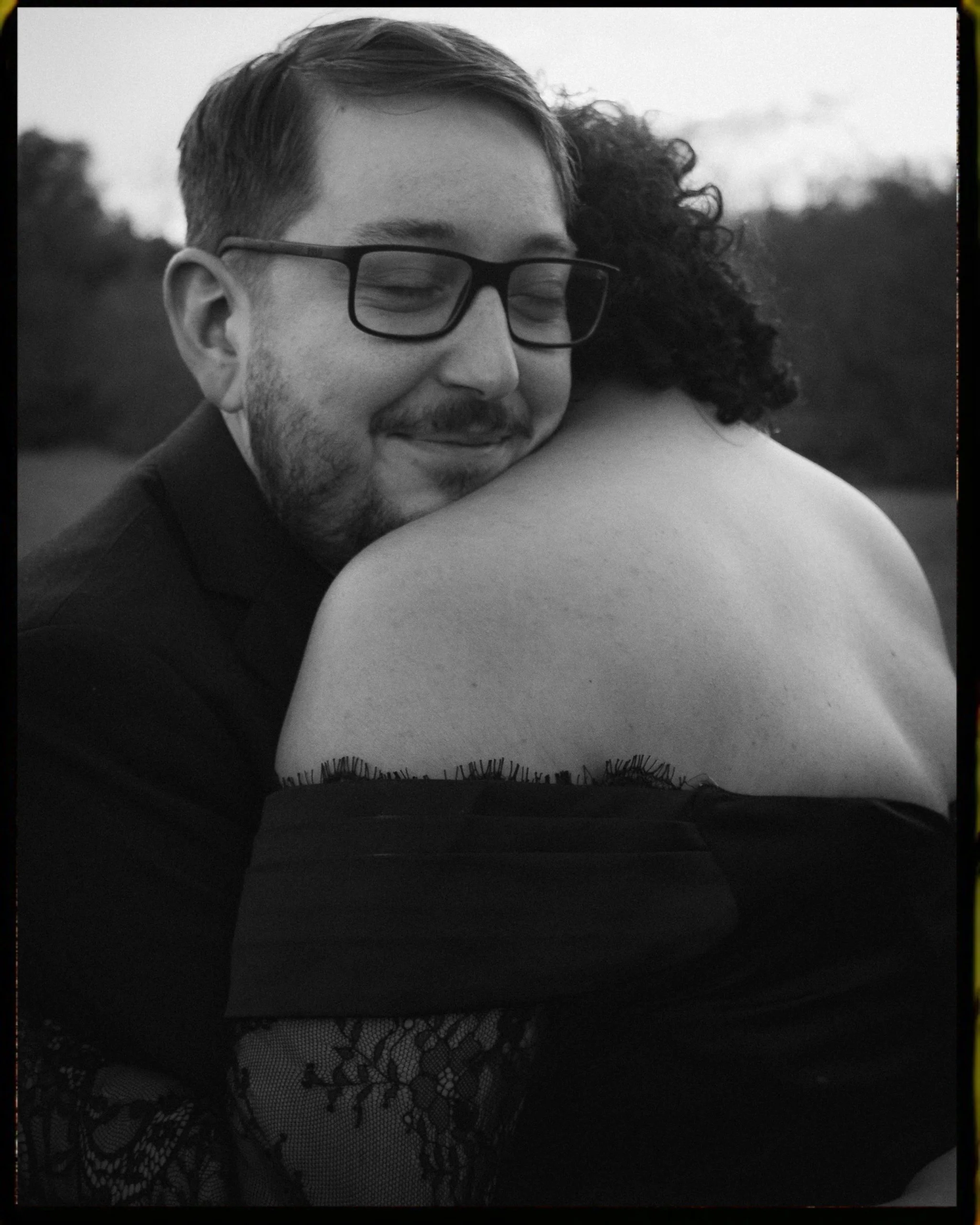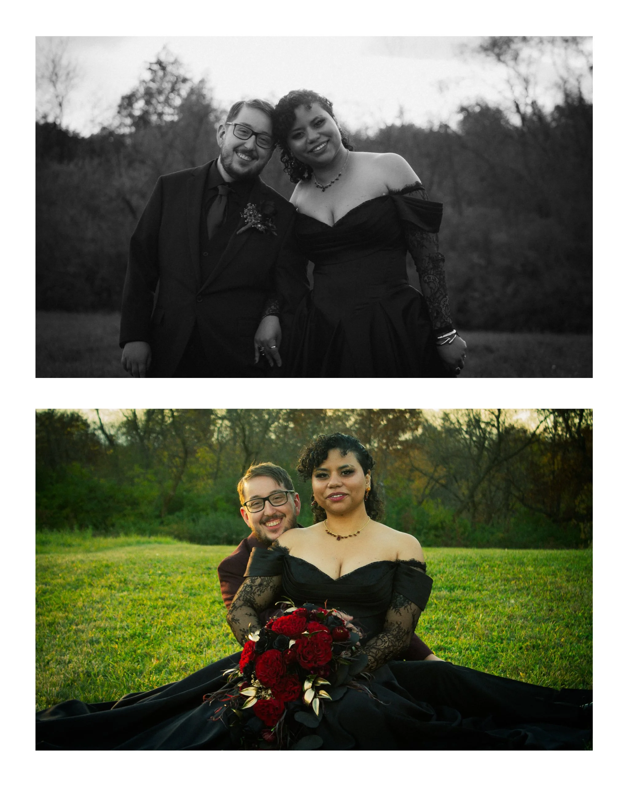 Alicia’s only real ask was that they wanted to have golden hour in some photos. For the whole ceremony and reception it had been overcast which every photographer knows is ideal lighting. However, just as we walked out some private photos of the two, the clouds parted and the sun shone like it knew it was needed. We were able to capture some lovely photos of them walking and sitting in the field, and everyone left feeling good and satisfied with the shots. The moodboard I was sent showed mostly dark, moody, and gothic romantic lighting and poses. I tried to replicate that in my editing and posing while still staying true to the couples own vibe and my personal creative eye. That’s why although every photo before the end was simple in editing design and leaned heavily on black and white, I had a little fun with the final set and darkened the lighting and colors in my edits. This is the third wedding I’ve done and each time I learn something new about the process and me as a photographer. I no longer fear weddings. I now welcome the challenge, and take supreme pleasure in capturing true love. Something that shines through no matter who’s taking the photo.