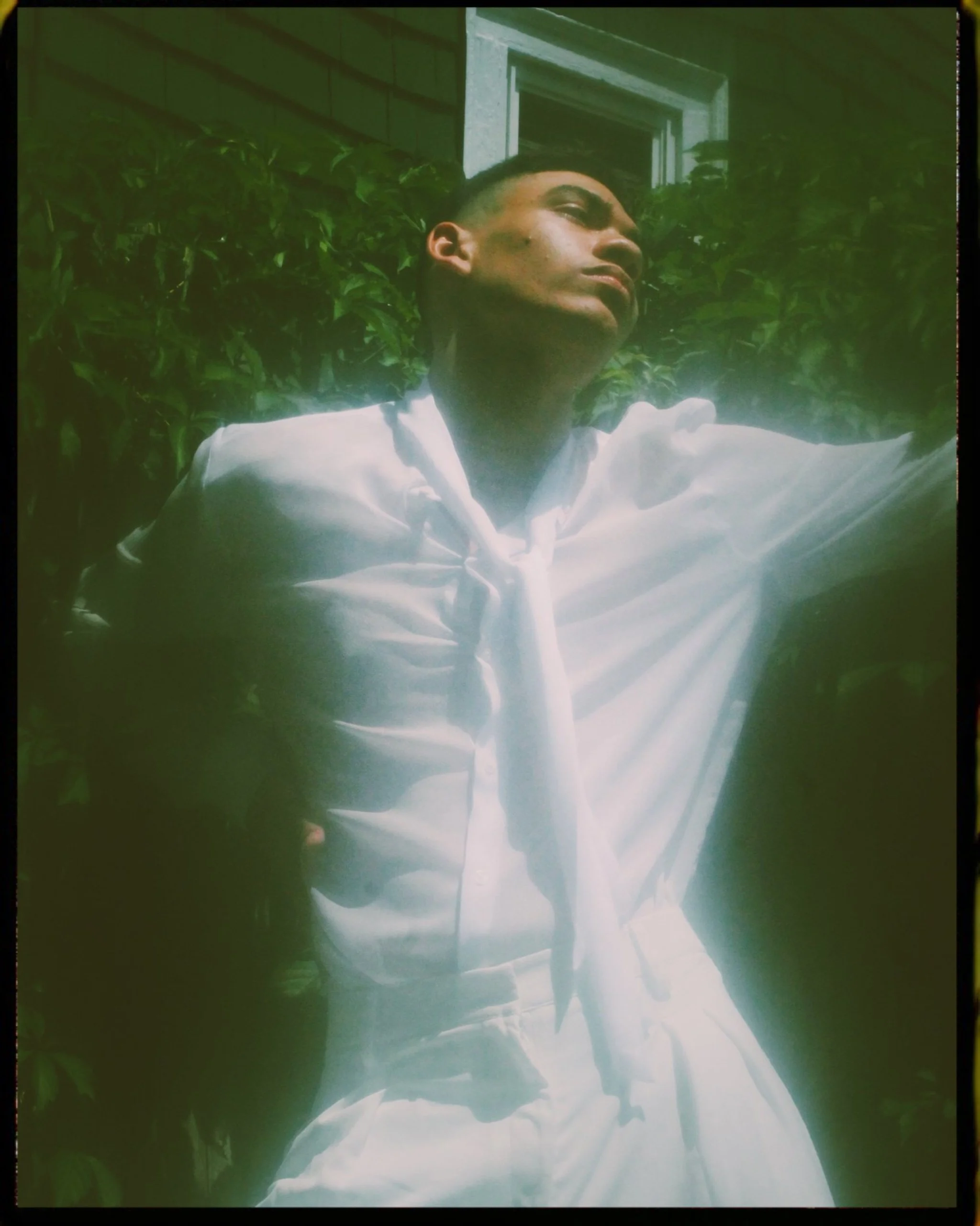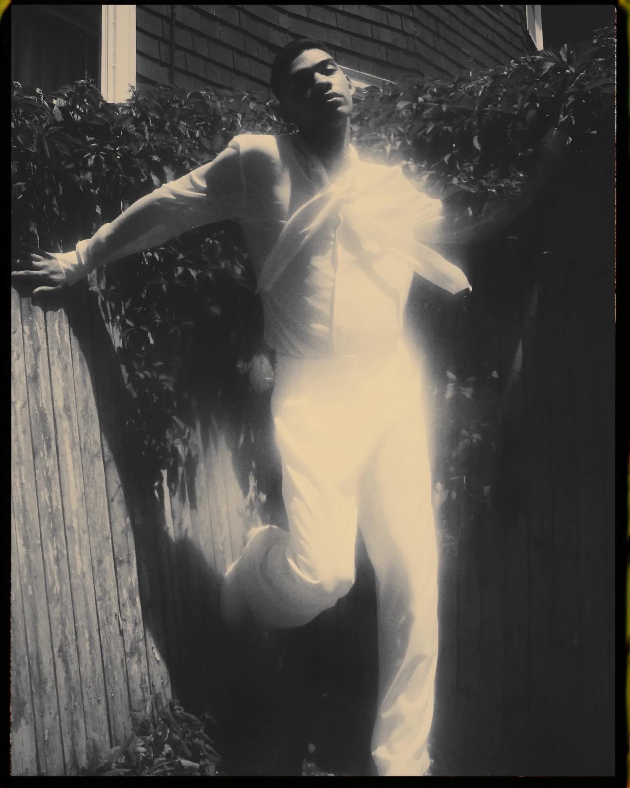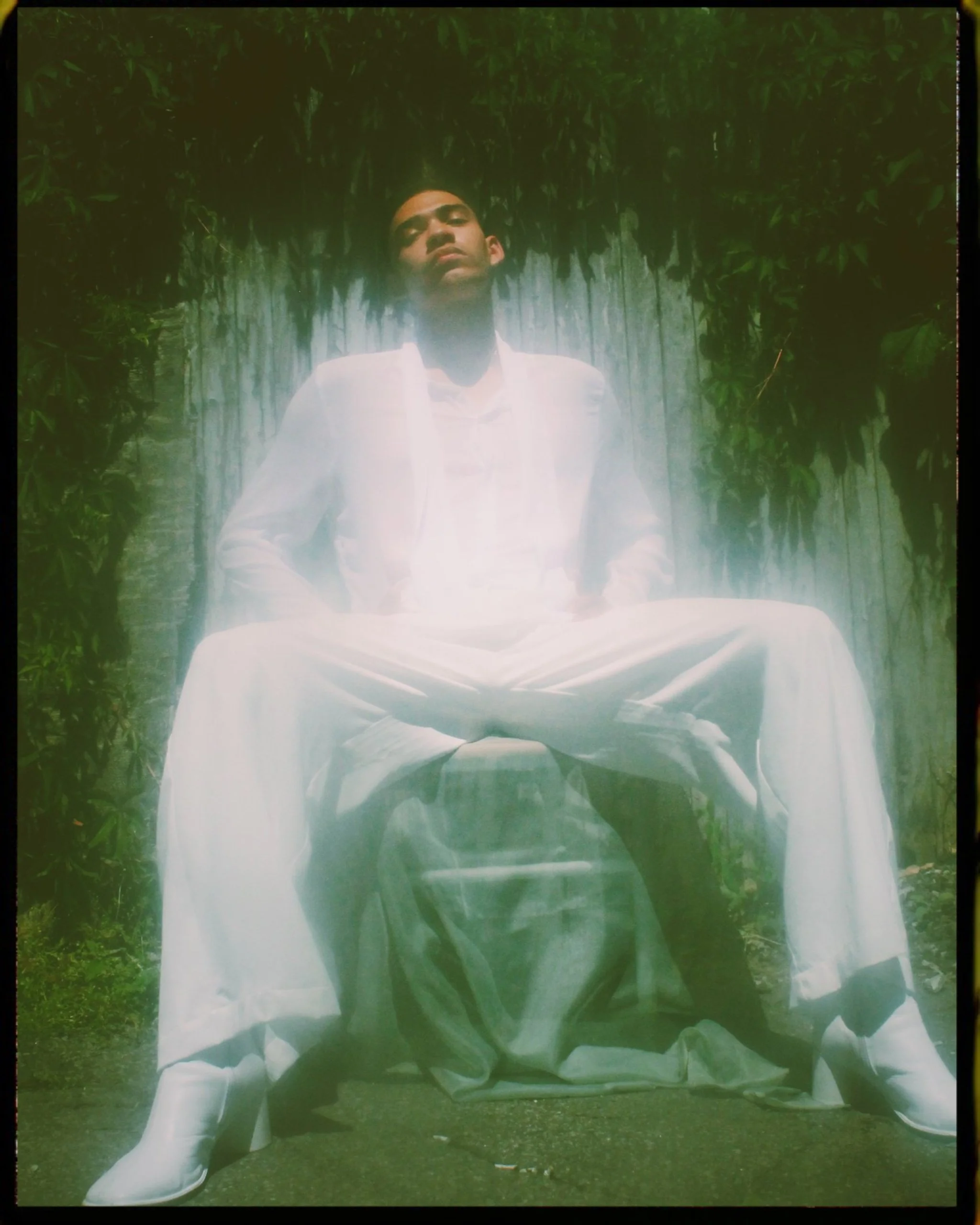 After learning how to get that dreamy effect for cheap on your lens (a little forehead grease), I really wanted to create my version of a magazine cover shoot. A solid color outfit, strong and dramatic posing, blurred edges and haze all around. Jazmany decided on an all white flowy fit that shined beautifully in the summer sun. We went into my backyard where I built a small set with some billowy satin fabrics and set up a chair. The story became a dazzling angel alighting in your backyard for a quick fashion shoot. I put a lot of distance between me and Jazmany for most shots to capture the full length of his limbs and make him appear larger than life. I aimed for ethereal, magical, heavenly, and an overall cool mood.