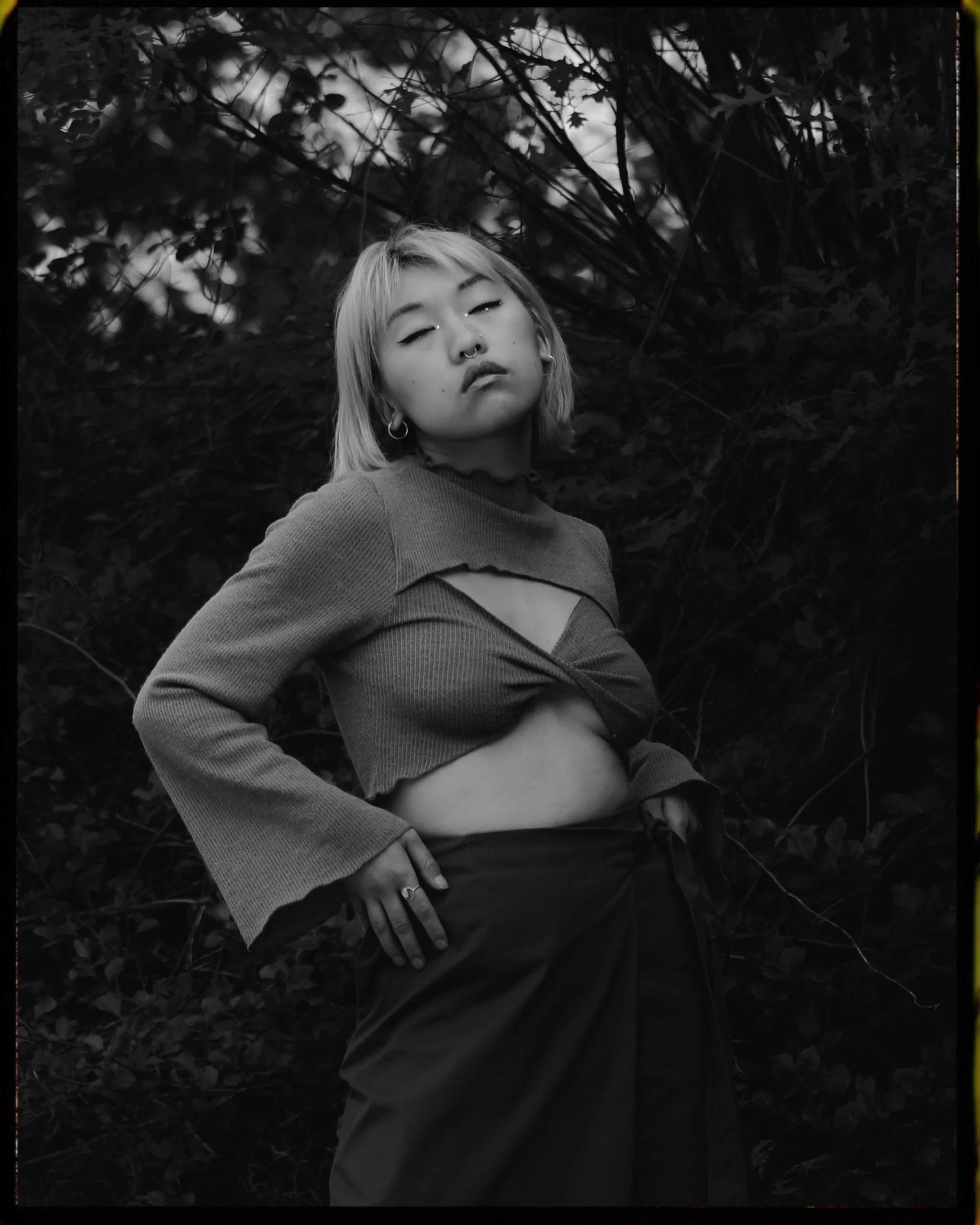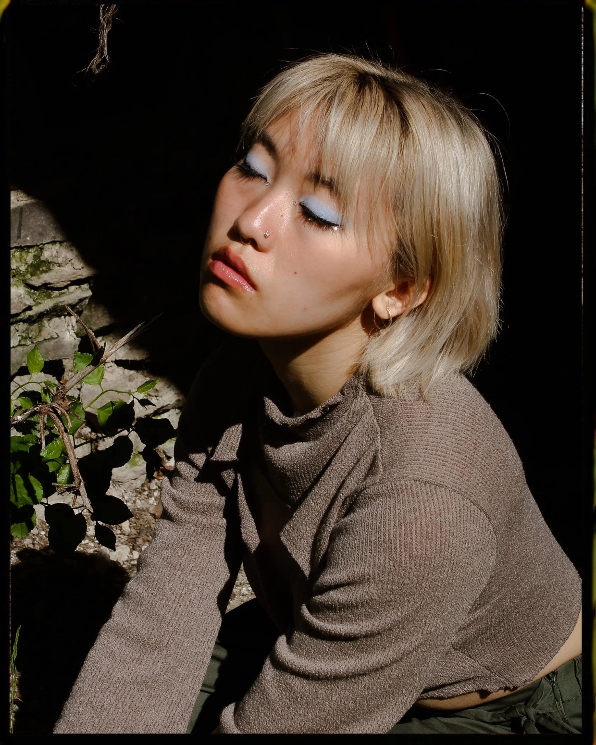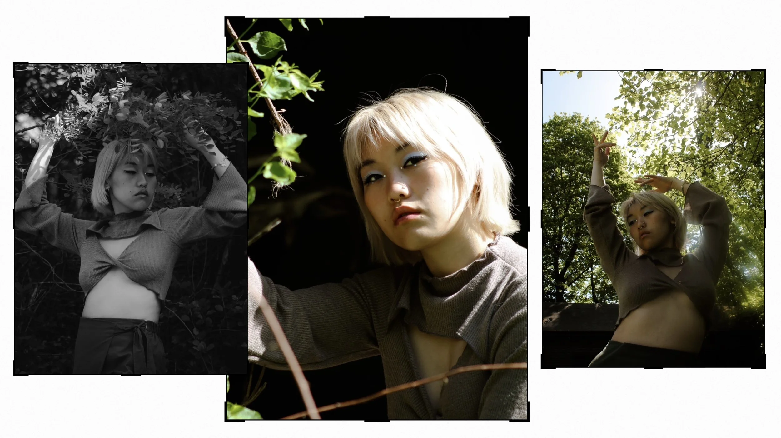 This was my very first shoot with Jessi. I saw them share a beautiful make up look online and instantly wanted to build a photoshoot around it. The look featured here is that very look, and from it I built the story of capturing a curious fairy playing at the boundary of her world and the human realm. Eventually she notices you and begins to perform for you. I found the location on my walk to work and thought it perfect for the theme, slightly abandoned and slowly being taken over by nature but still filled with evidence of human presence. I took a strong lead directing Jessi in poses from the angle of their body to the shape of their hands. At a certain point I had them dance for me and followed them capturing the movement mid motion. I wanted the mood invoked to be whimsical, magical, playful, and curious all at once.