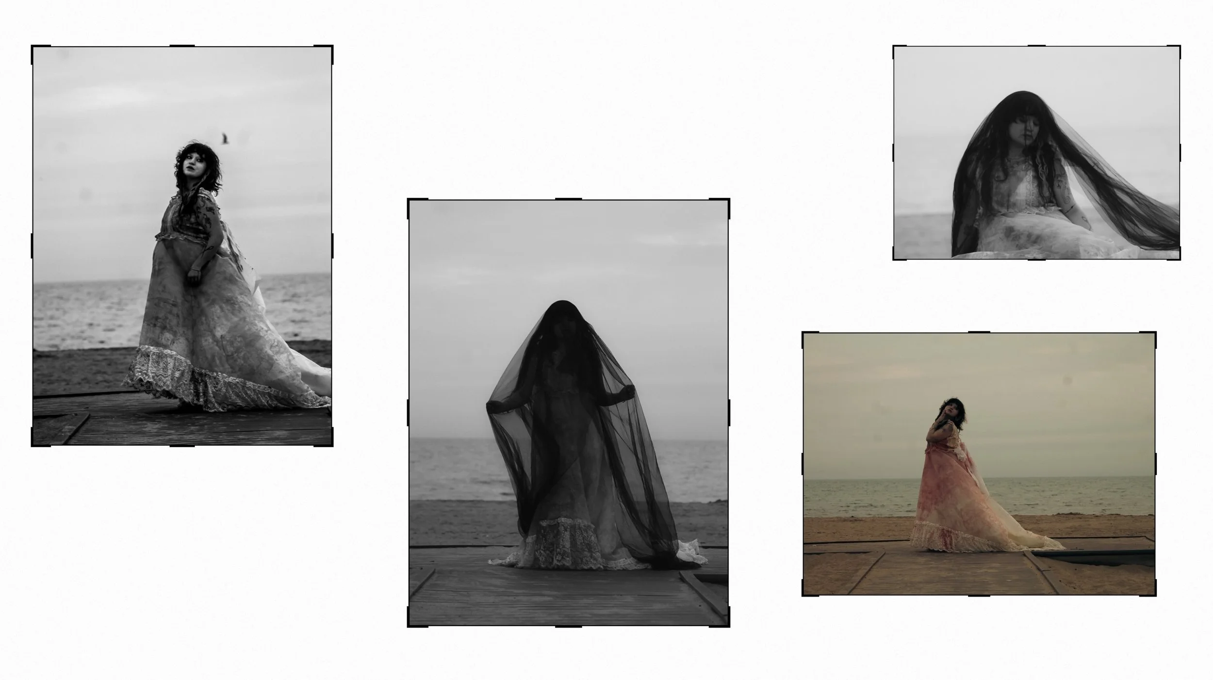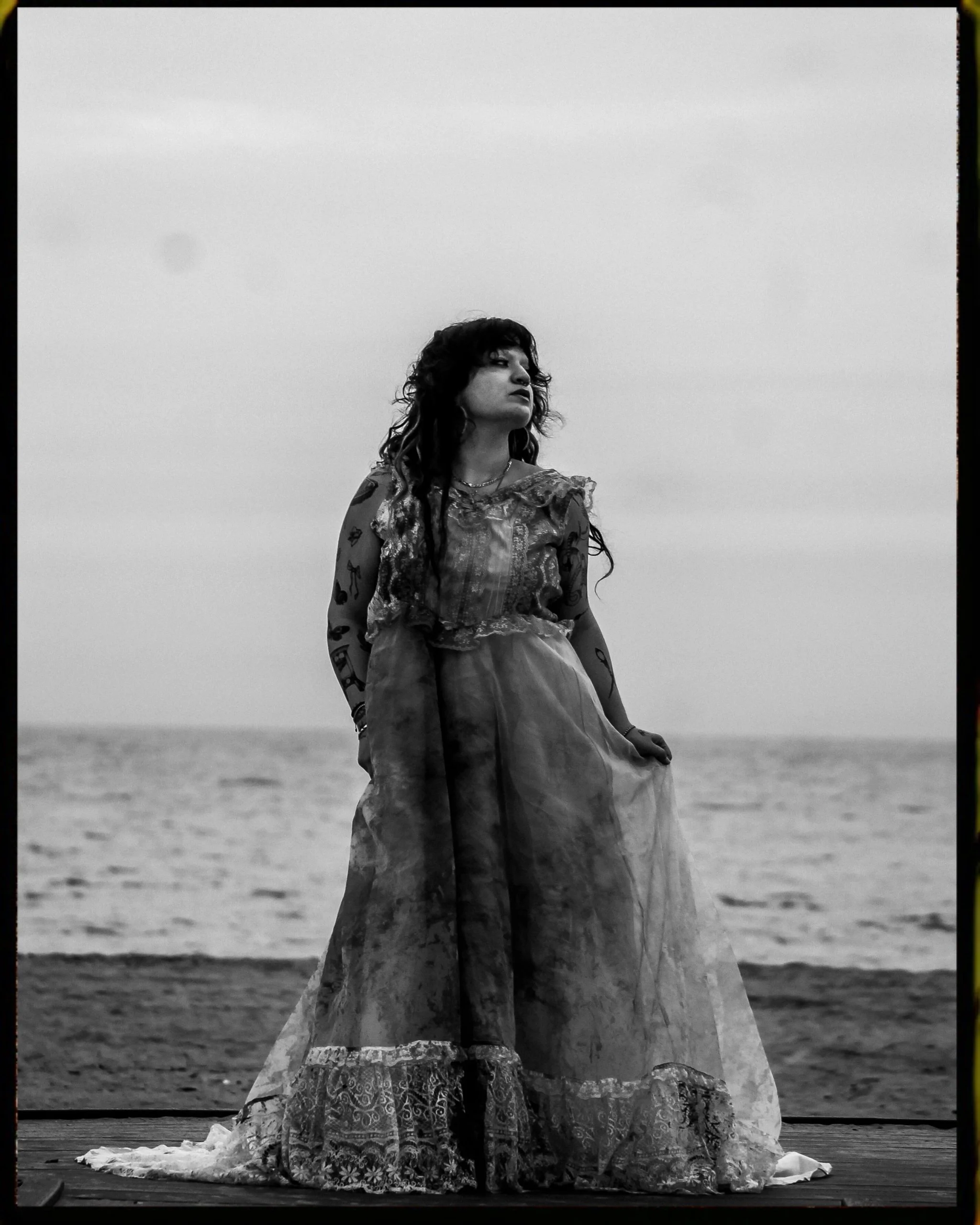 Kailey came prepared for any and everything with multiple outfit choices, veils, and a bag of fake blood to boot. I was ready to get crazy. For all our props and energy, we didn’t have a clear plan about what we wanted to create. We just showed up ready for whatever and let the shoot take us where we felt like going. The beach had a dock, an artfully piled bunch of boats, and barren beachball stands that resembled something of a graveyard. We got dressed and got to work. I found the story as we went or rather the story found us and begged to be told. A runaway bride. A woman scorned. Returned to the water where she lost her love to cleanse herself anew. To curse the fate she was given in blood and tears. It’s giving women in black. A soul enshrouded in grief. Drunk on pleasure to blind the pain. These were the phrases running through my mind as I snapped away, posing minimally as Kailey’s excellent body awareness left little room for improvement.