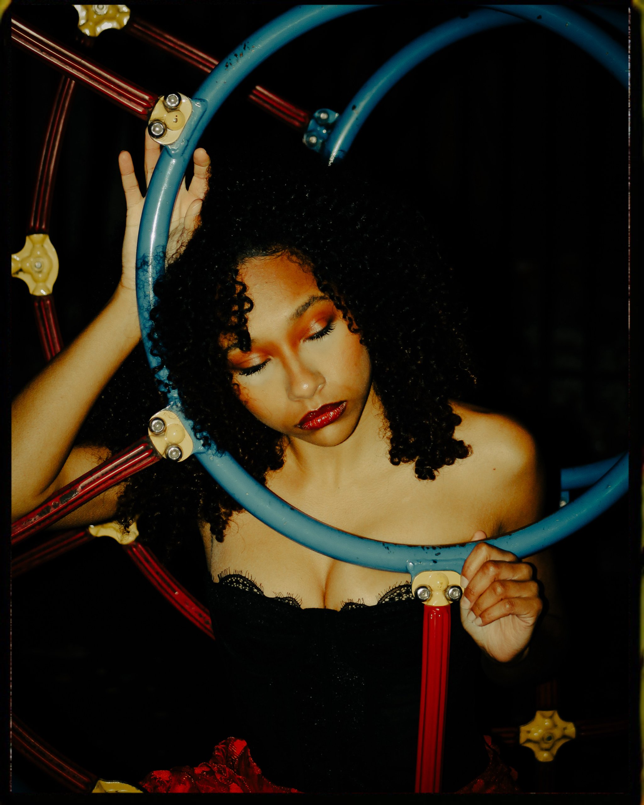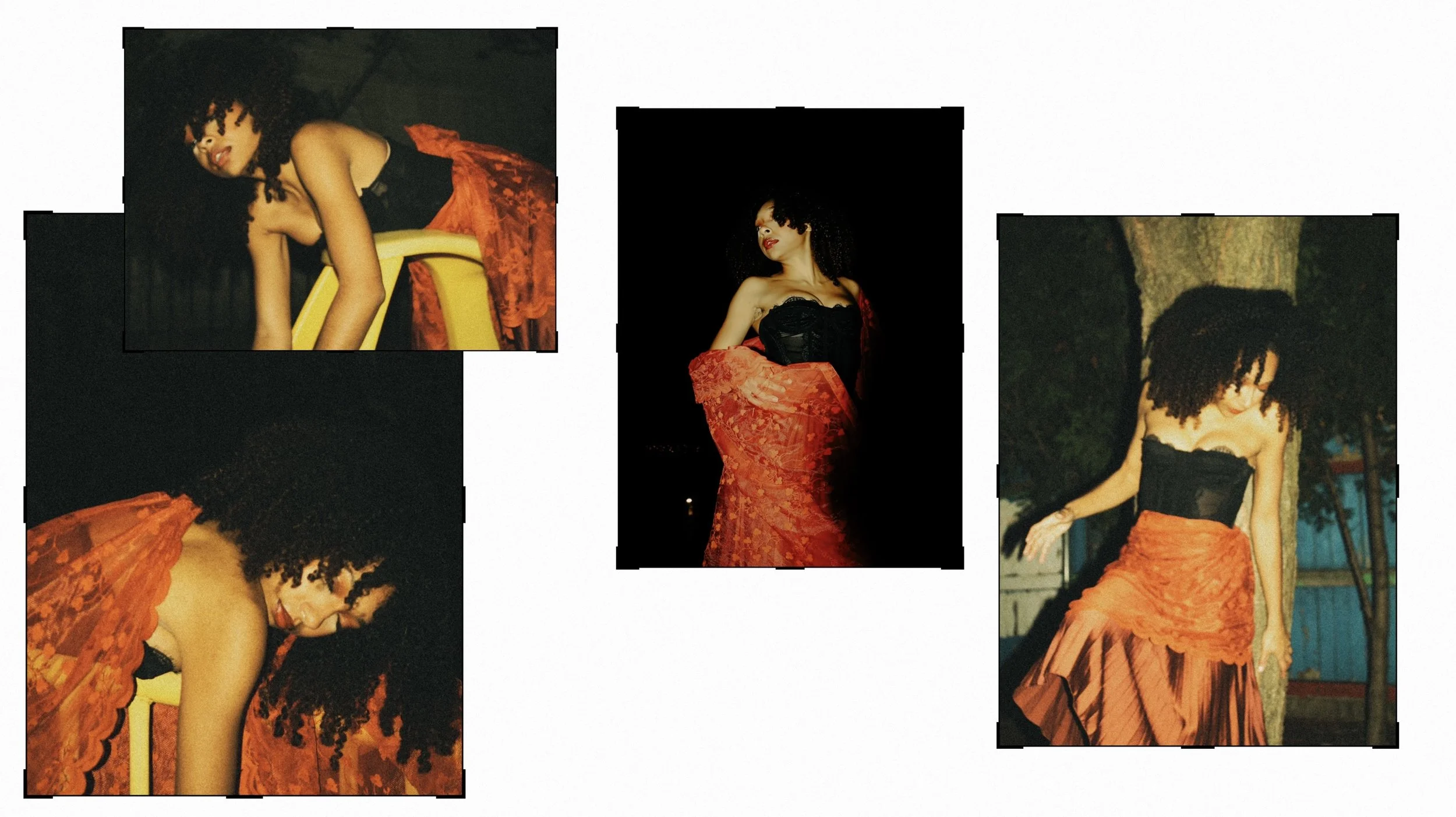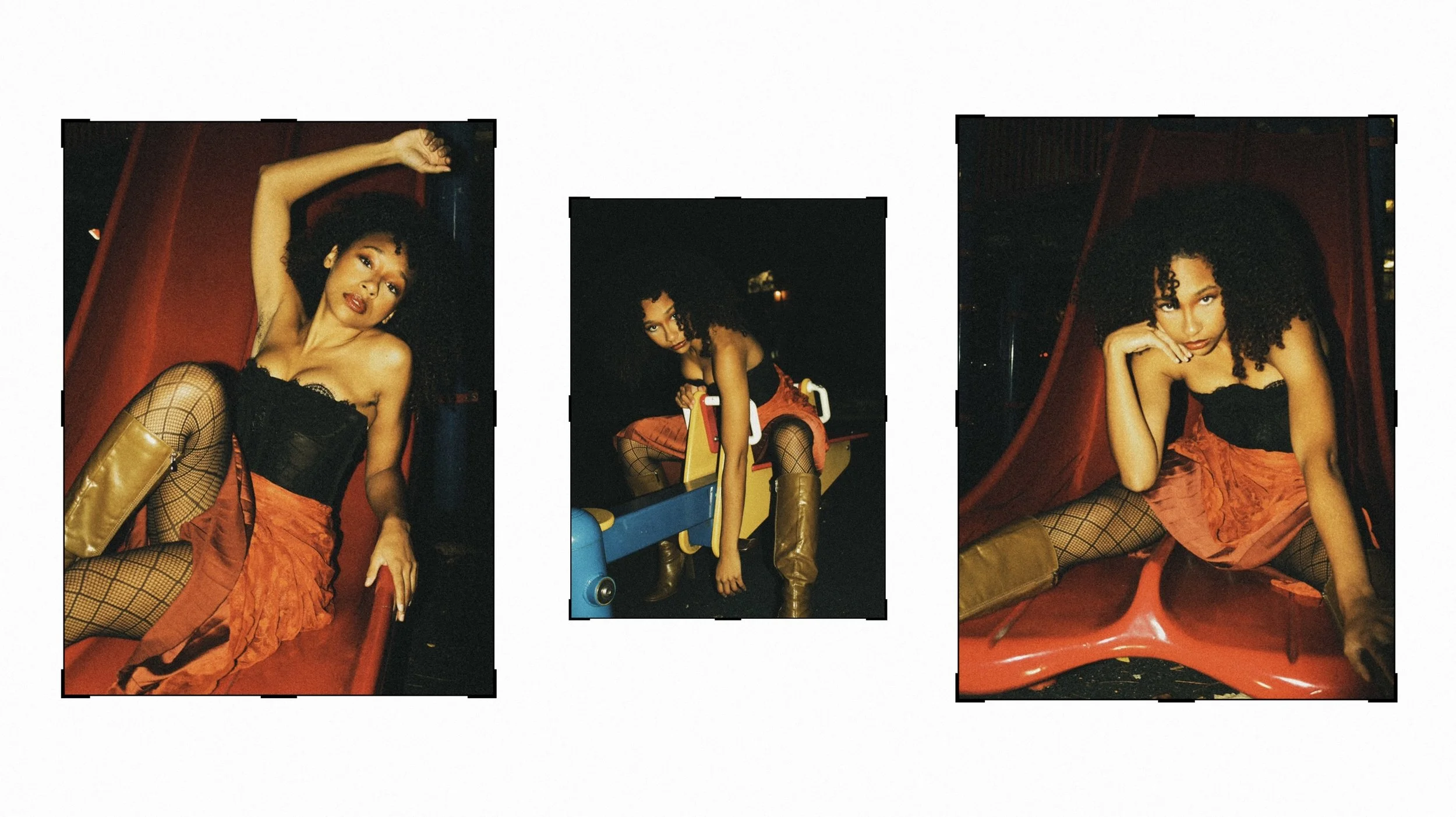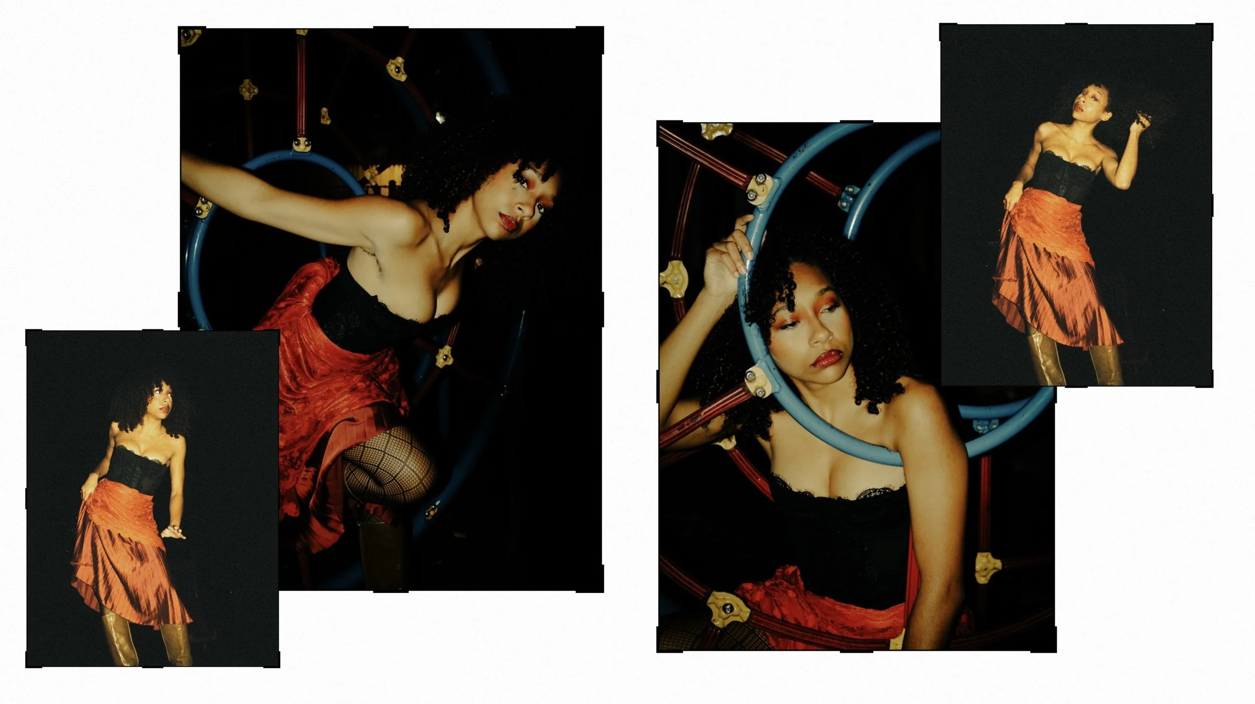 This shoot was really interesting because I didn’t have a clear vision of what I wanted to create, just small elements I knew I wanted present. The main mission was to create for fun, as I’d been doing nothing but very corporate or simple shoots lately where I had little to no creative freedom. The children’s park we shot at is right next to my house and every day I walk by it to go to work. What caught my creative eye were the twin spider-weblike climbing structures and I knew I eventually wanted to do something with that. My favorite thing to do in shoots is have a stark contrast between the fit and the environment, so I thought doing something very fancy with lots of lace and movement could be cool to see against a child’s playground. Extremely sexy and mature vs the playfulness and innocence of childhood. I sent Kaline(the model and my best friend) a moodboard for inspiration on how to dress and let her do the rest styling wise. She went more Victorian than I expected but I loved it, and she even utilized a curtain to get some fun layers and movement.