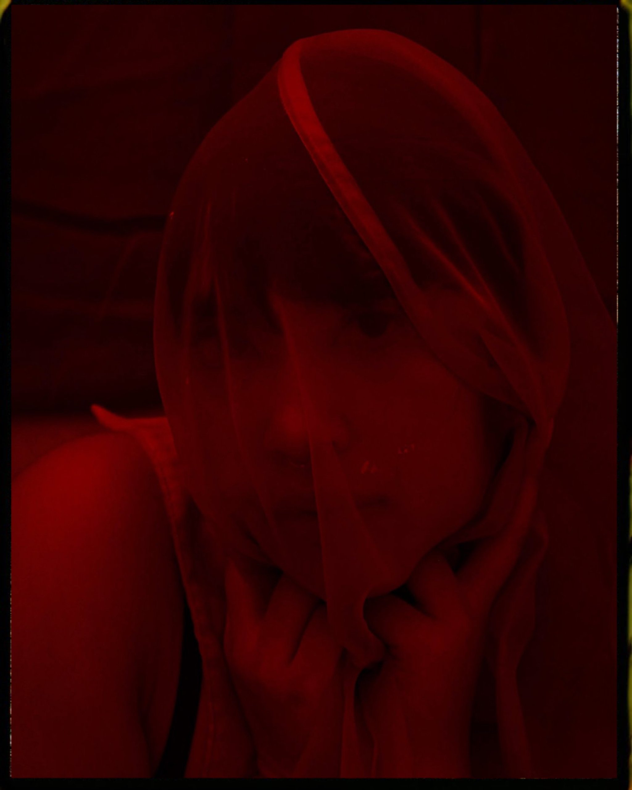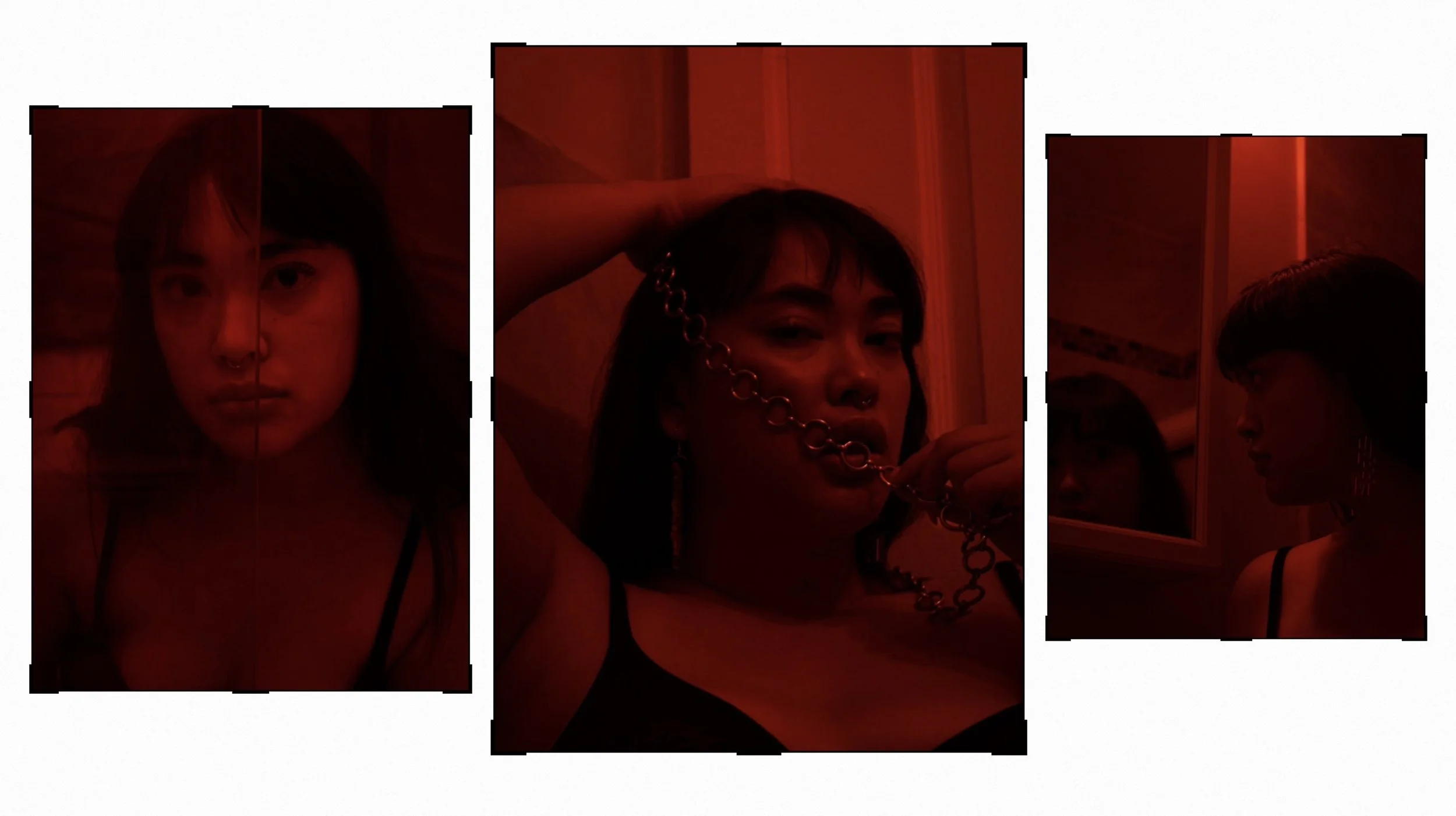 I have always been drawn to dark, gothic, and horror in style, movies, and art. I bought a pair of red light bulbs and wanted to see what kind of mood I could create. I originally thought it would be very sexual but it quickly turned into moody and spooky which I loved even more. I used one of my sheer shirts and had Katy play with it over her face, aiming to almost look like asphyxiation. I loved the depth the red lighting gave and also took away. We also played with reflections in the mirror, my bathroom was very tiny so we could not do too many poses or extend far as it would take her out of the frame. So we focused on small corners which wound up being even cooler, making Katy appear much farther than she was, as if you were seeing her down a hazy dream like tunnel. I asked her to look almost pained in most shots as I leaned further into the horror theme, I wanted it to feel psychological, like she was a tormented specter.