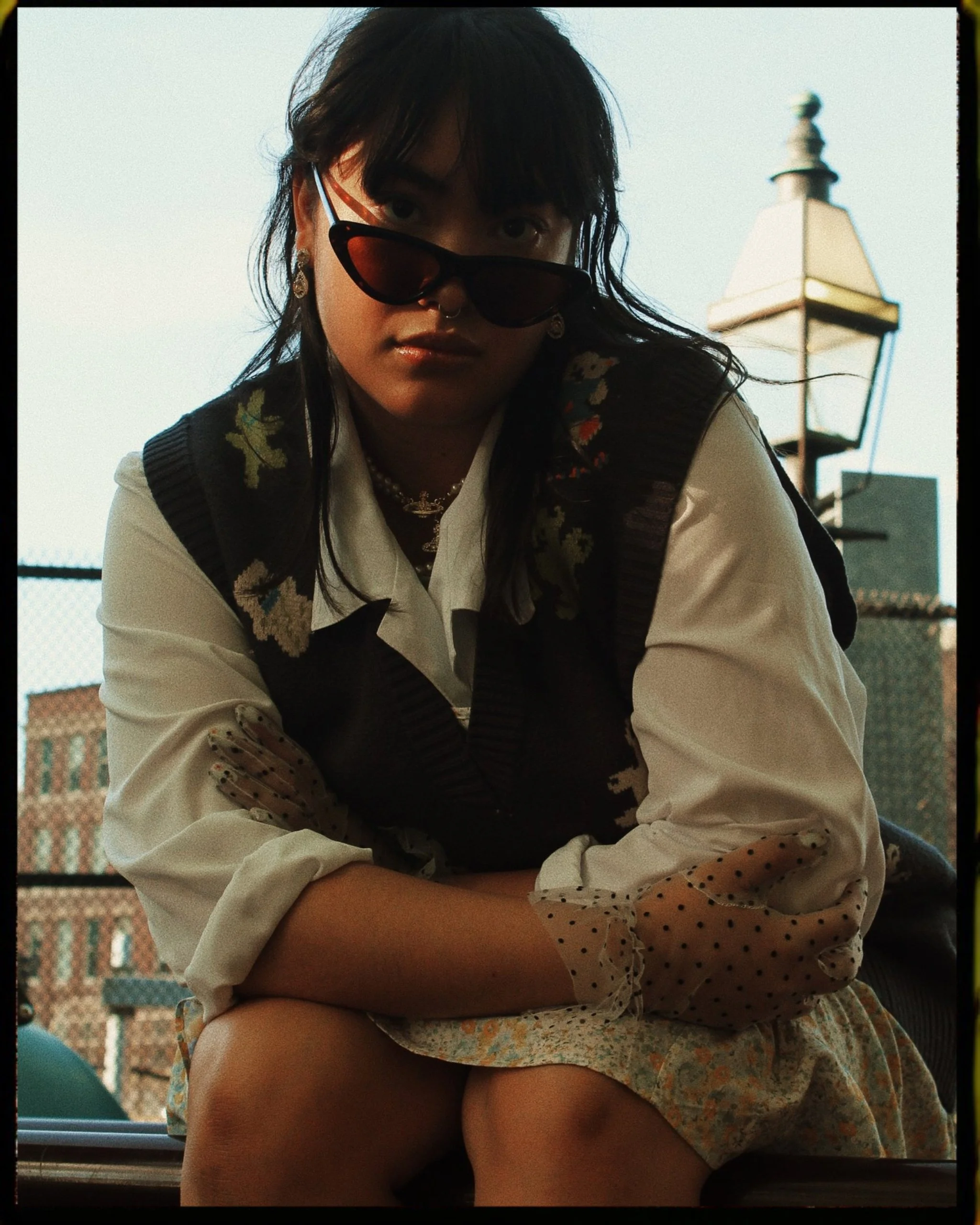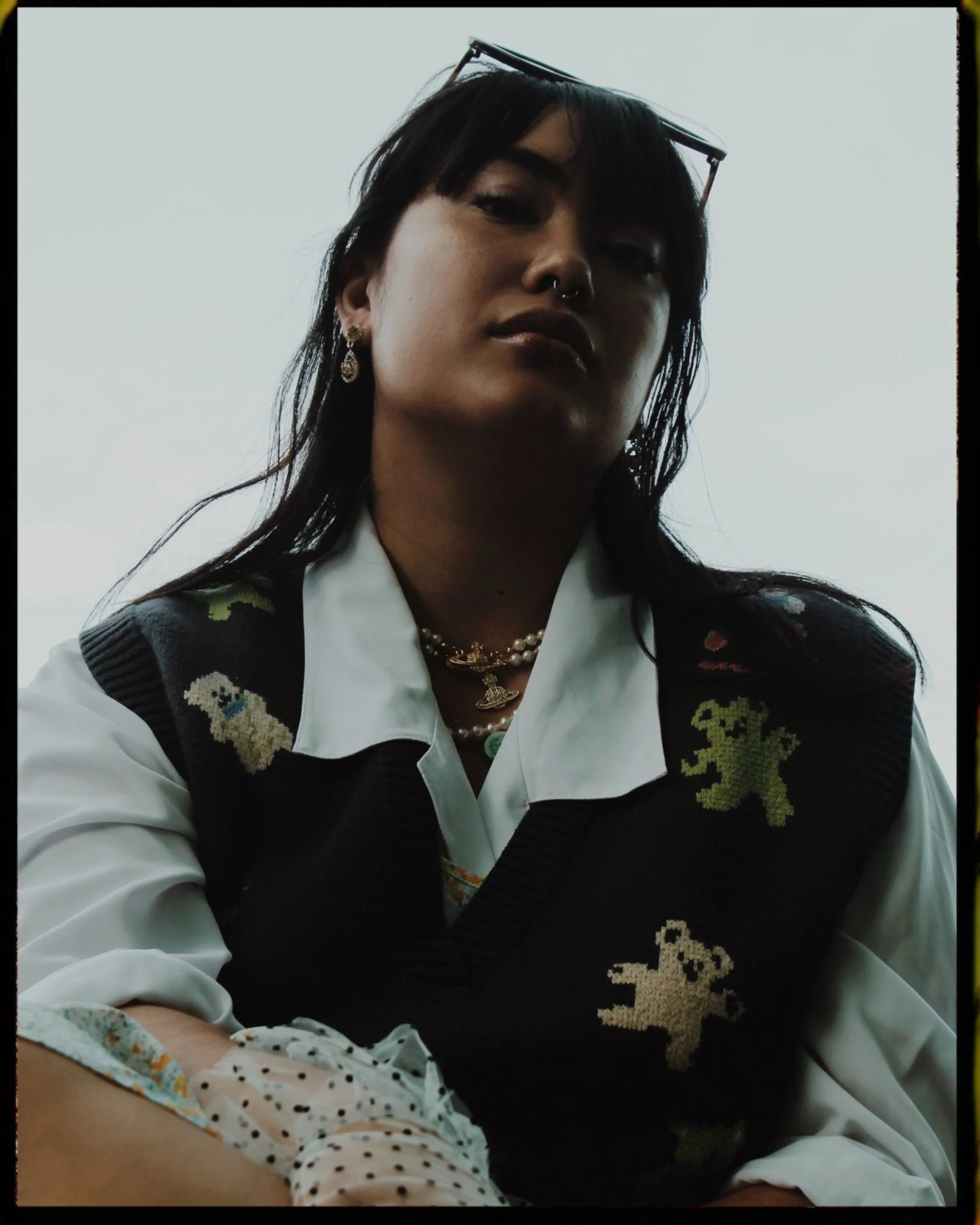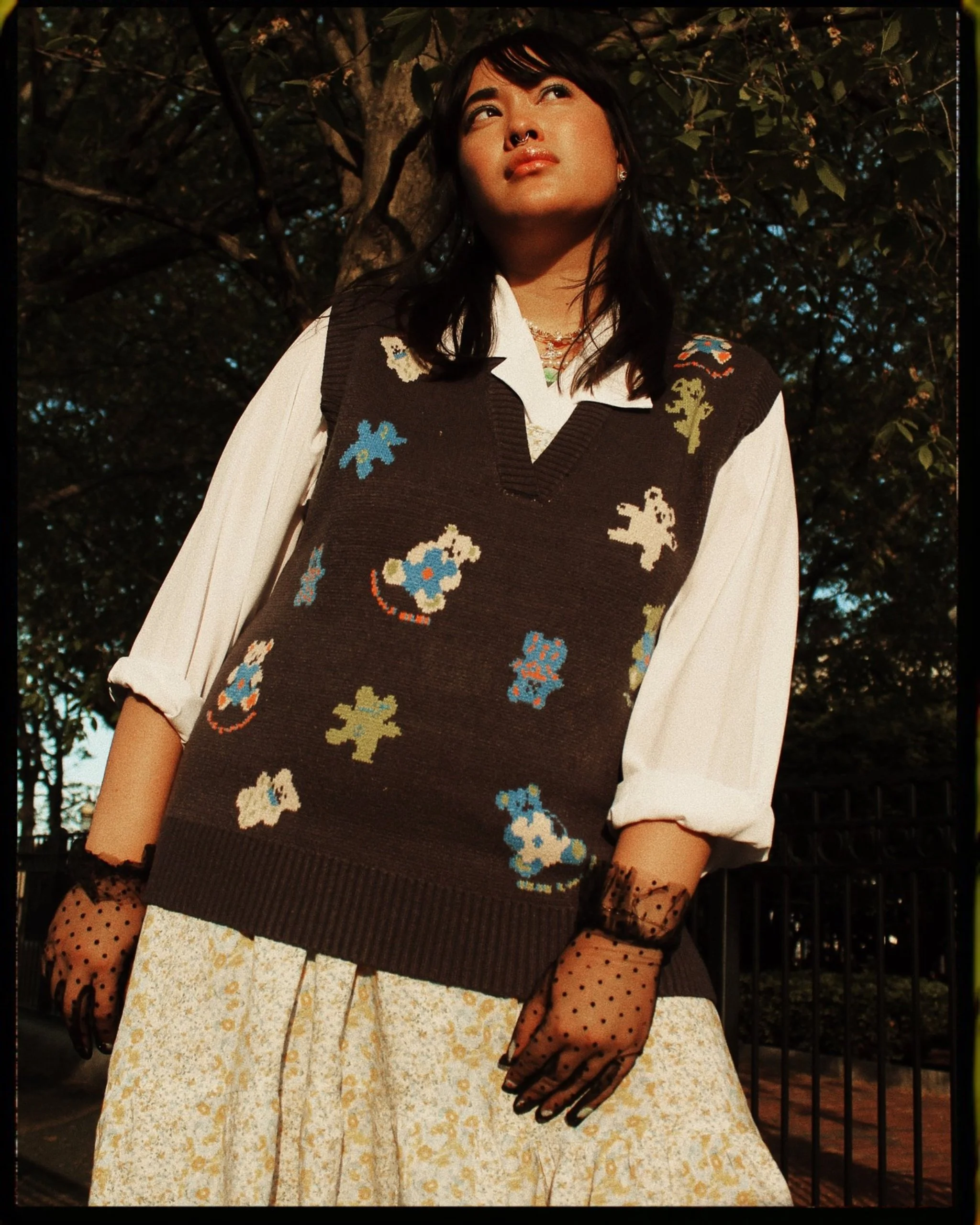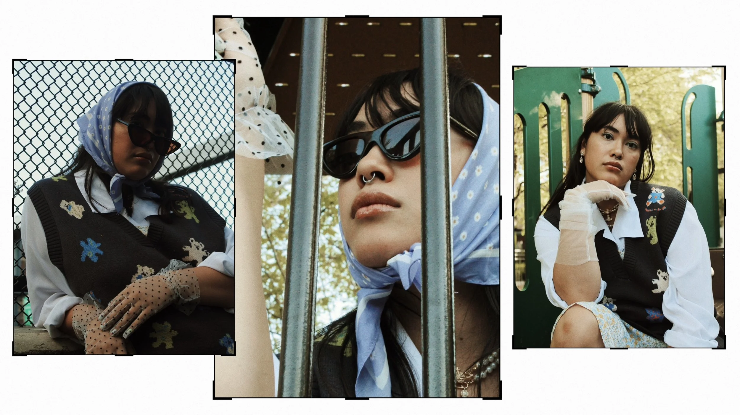 I have always loved playgrounds as settings for photoshoots. There are so many diverse angles and shots you can take because of the different “props” i.e. jungle gym, swings, bars, children’s toys, and it’s always fun to bring a sort of high fashion editorial vibe to the youthful and fun setting which is exactly what we did here. I wanted a sort of preppy but whimsical vibe so I asked for a sweater vest, pleated skirt and mary janes and let Katy take free rein for accessories. I also brought a pair of sheer dotted gloves that I thought brought in a dainty element while tying the look together and would be fun to play with in close up shots. The playground we shot in was not directly in the sun so we had a sort of cool and gloomy atmosphere while shooting before the sun peeked through in the end. As I edited I leaned into that and highlighted the blues and greens of the photos to complete the cold look.