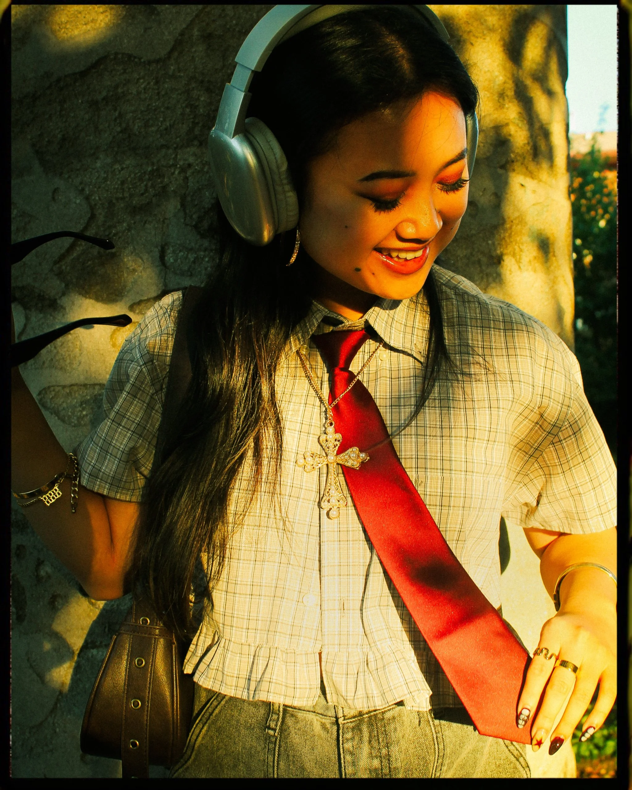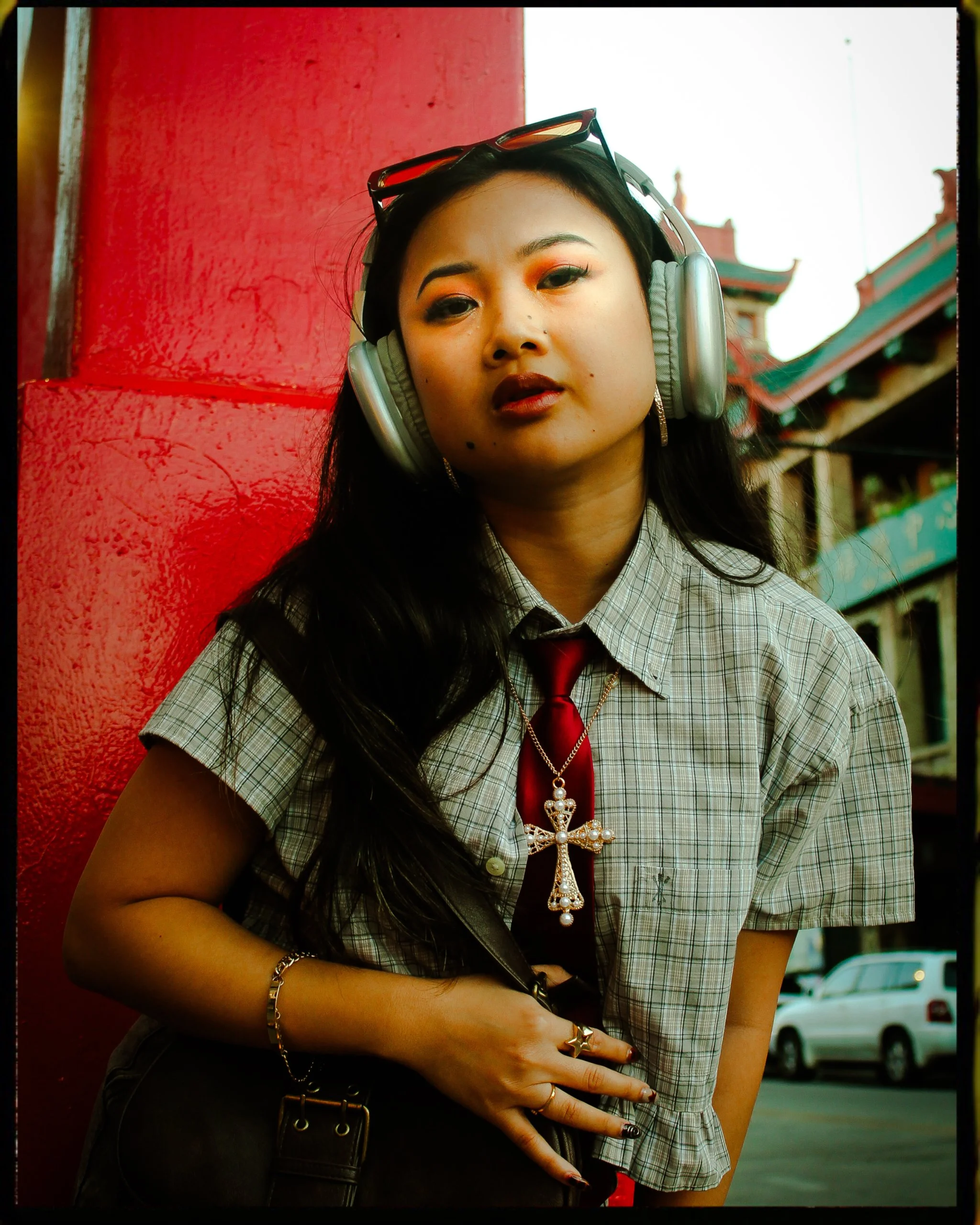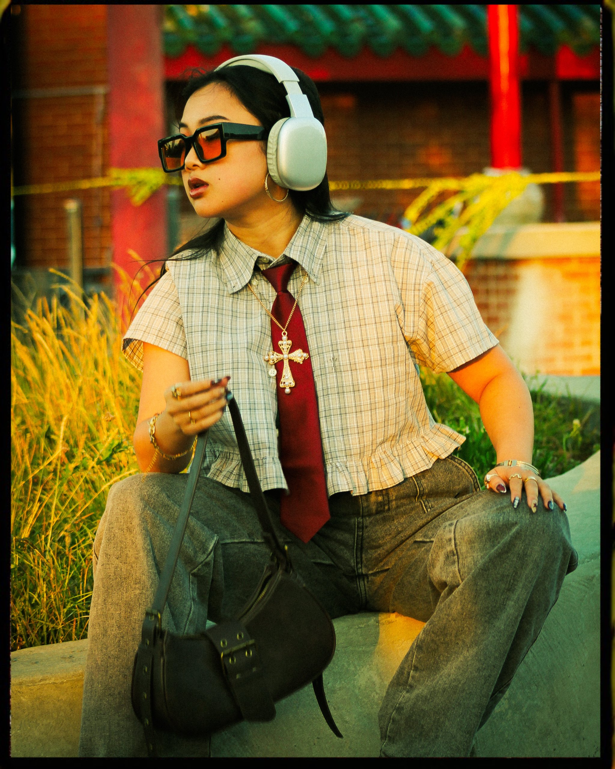 She also brought headphones and her purse to use as props throughout. Fashion photography is not my go to style so I found this shoot to be an interesting practice in what to look for creatively. Where do I want my viewers eye to go, when the whole fit is the focus? Do we do close ups of details, wide shots for storytelling, or keep it simple and do bust up portrait style? I tried to mix the three together, while choosing interesting backgrounds in Chinatown that I thought would compliment her look. Michelle’s one request was that she wanted to work with golden hour. That made me a little wary at first. I love golden hour I do, but the glow is sometimes too strong and gives my models an oversaturated, burnt orange look that I find hard to deal with in editing. We got to Chinatown in the middle of golden hour and rather than run, I leaned heavily into it. I played with shadows from trees, having the light highlight only part of her body and face, and peek-a-boo sun spots in the background instead of directly on her. I think what we wound up with was glowy and gorgeous, while still keeping some of that “hard”, “tough girl fashionista vibes” that was our original theme.
