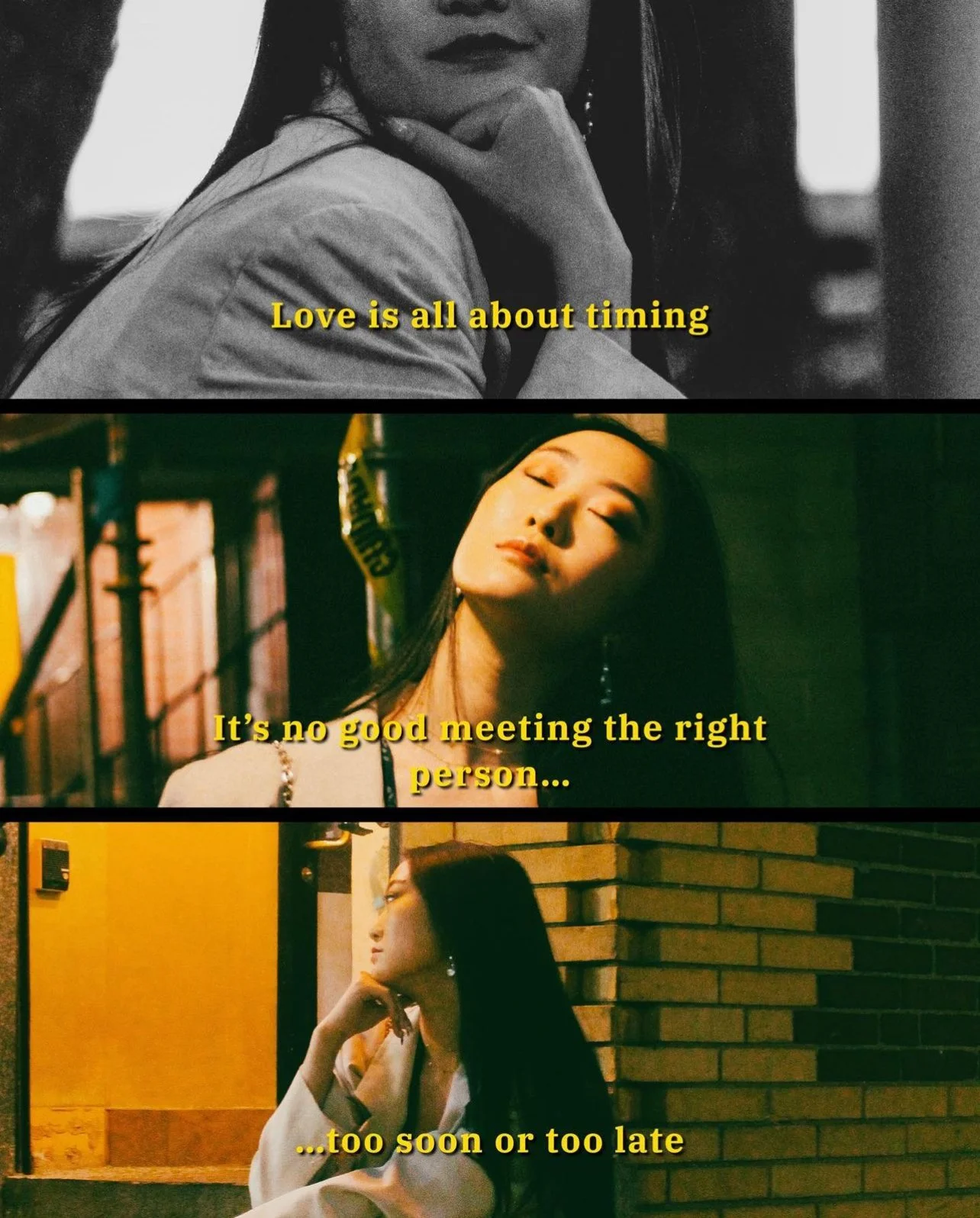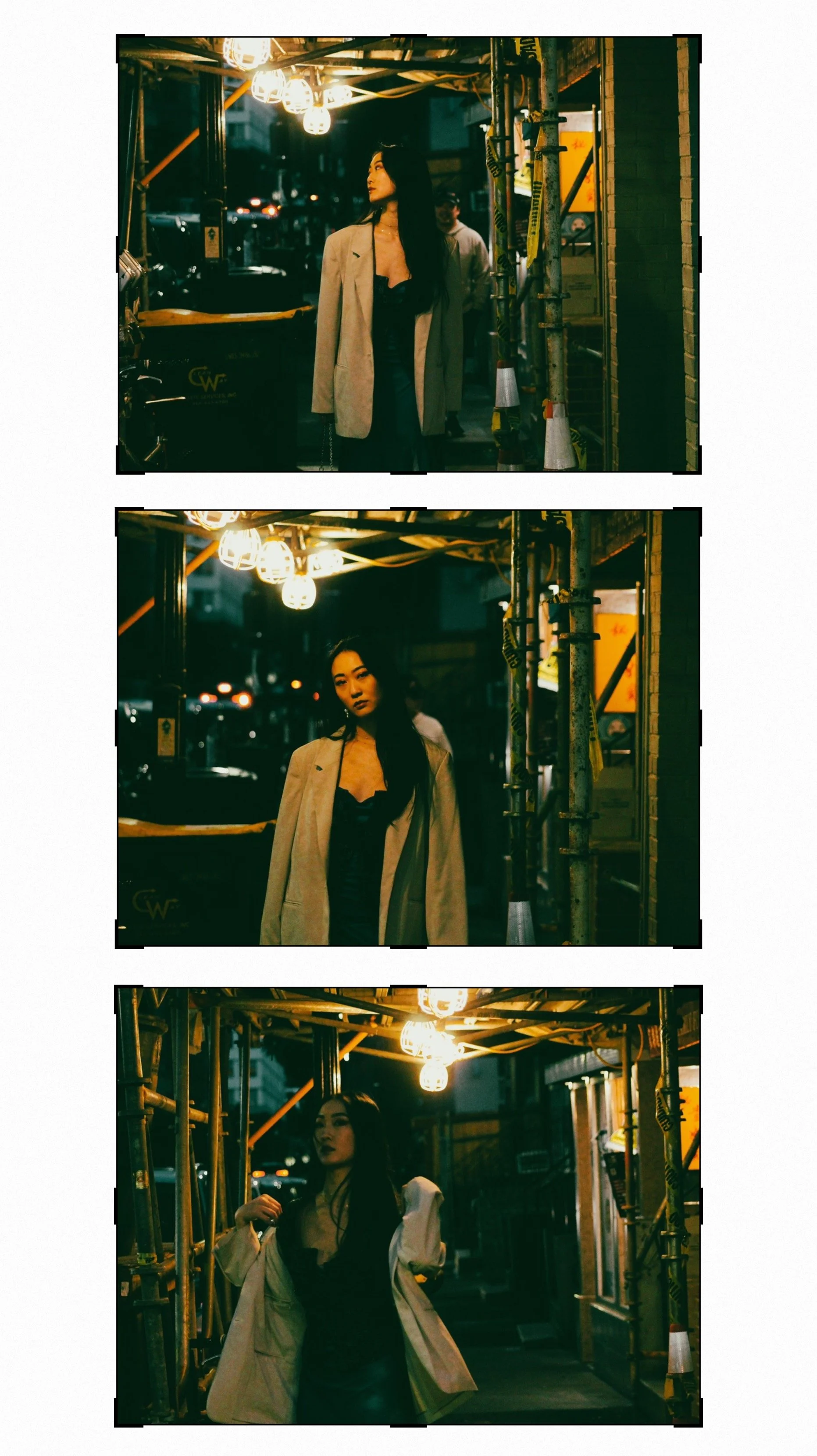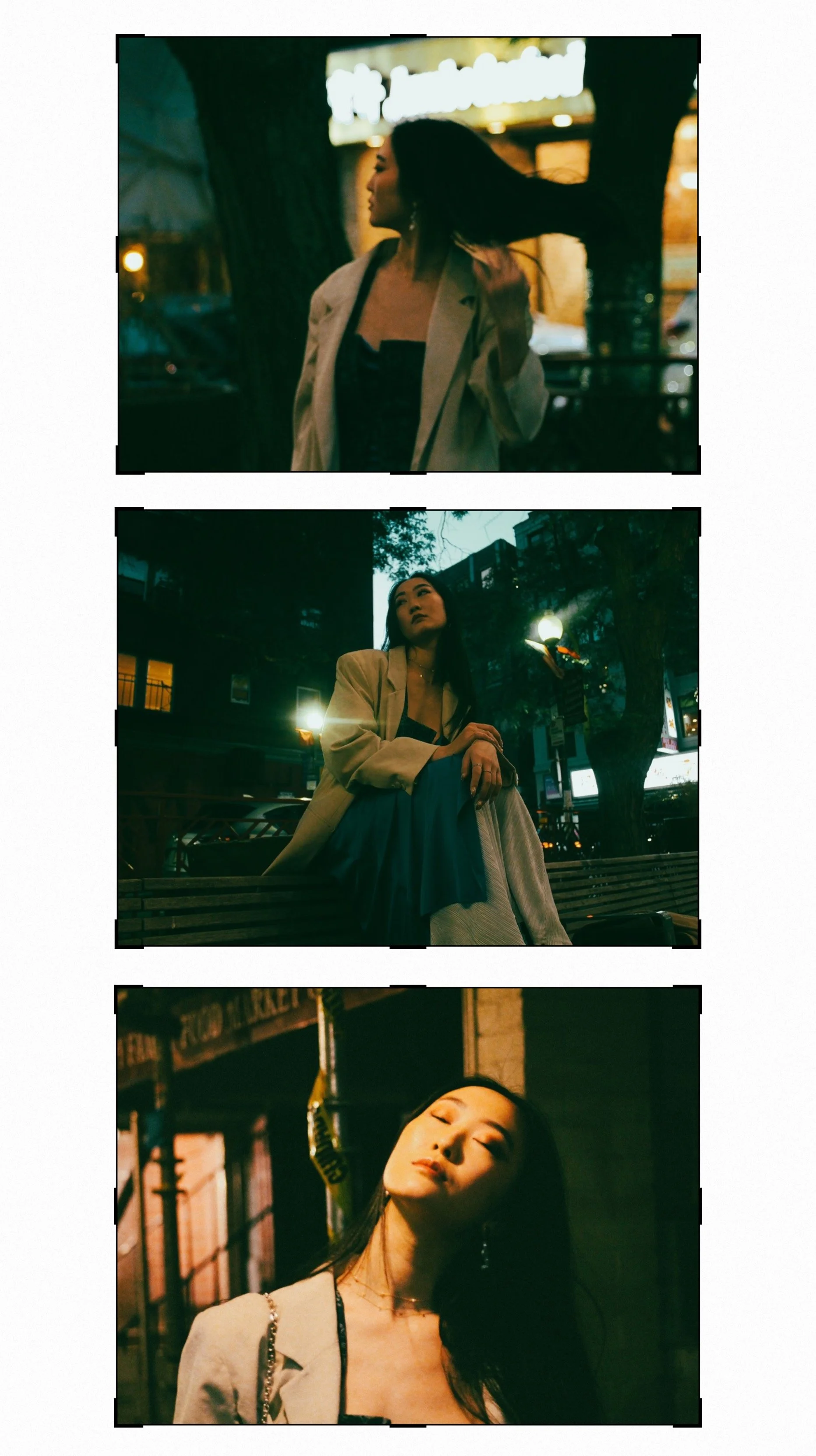 Since the finished products of this shoot felt like a tribute to Wong Kar Wai I wanted to fully embody that when sharing it online and decided to experiment with overlaying lines from some of his most famous movies atop the images. I was surprised by how well they fit the mood of the shoot considering that wasn’t the shoots mission when we started. It’s also interesting to see the stories you can create simply by changing which part of the photo you show. I could not have the full image in each frame so I had to adjust what was shown based on what I felt fit the words above it. This process made me all the more excited to dive into the world of cinematography and experiment with more of its elements.