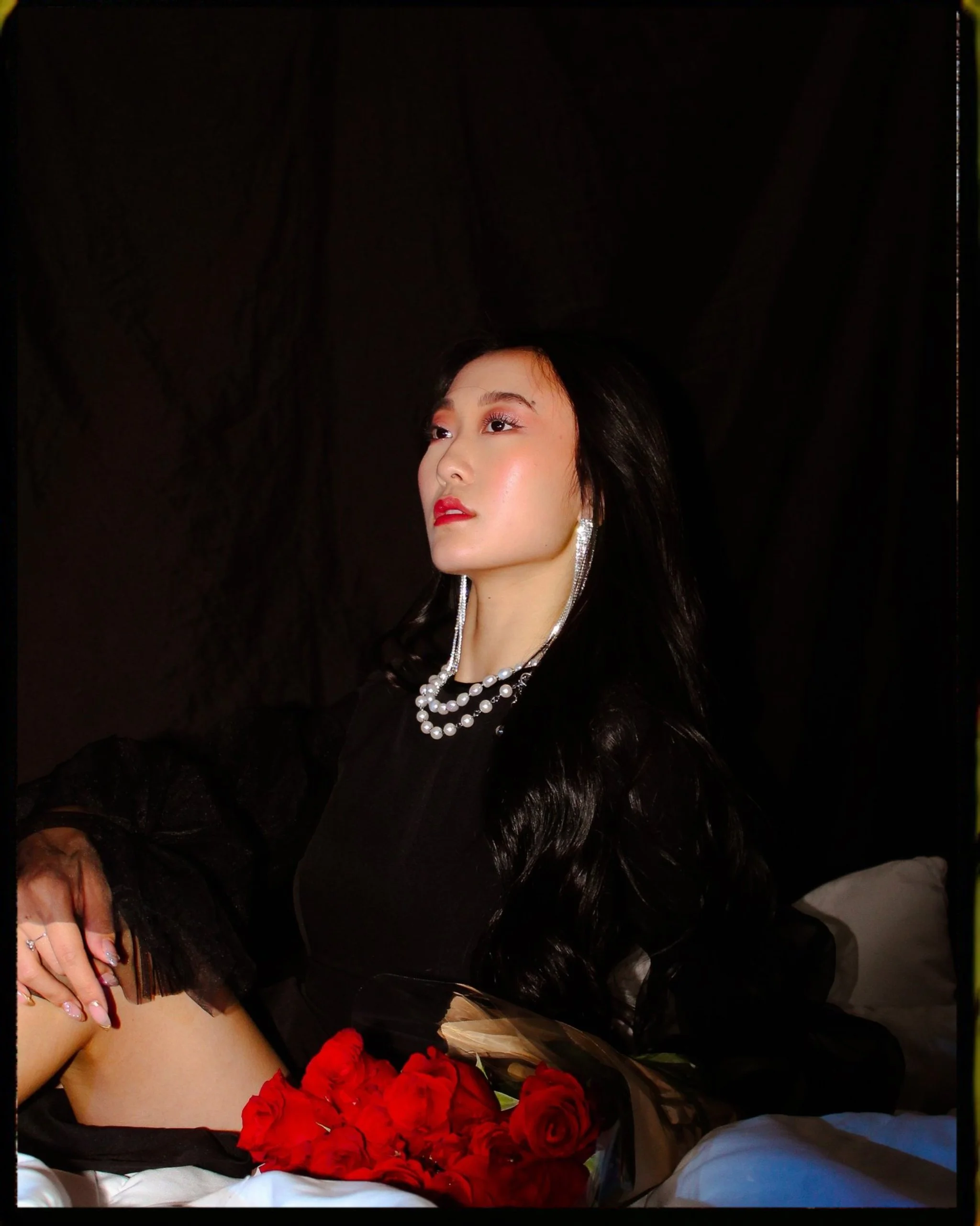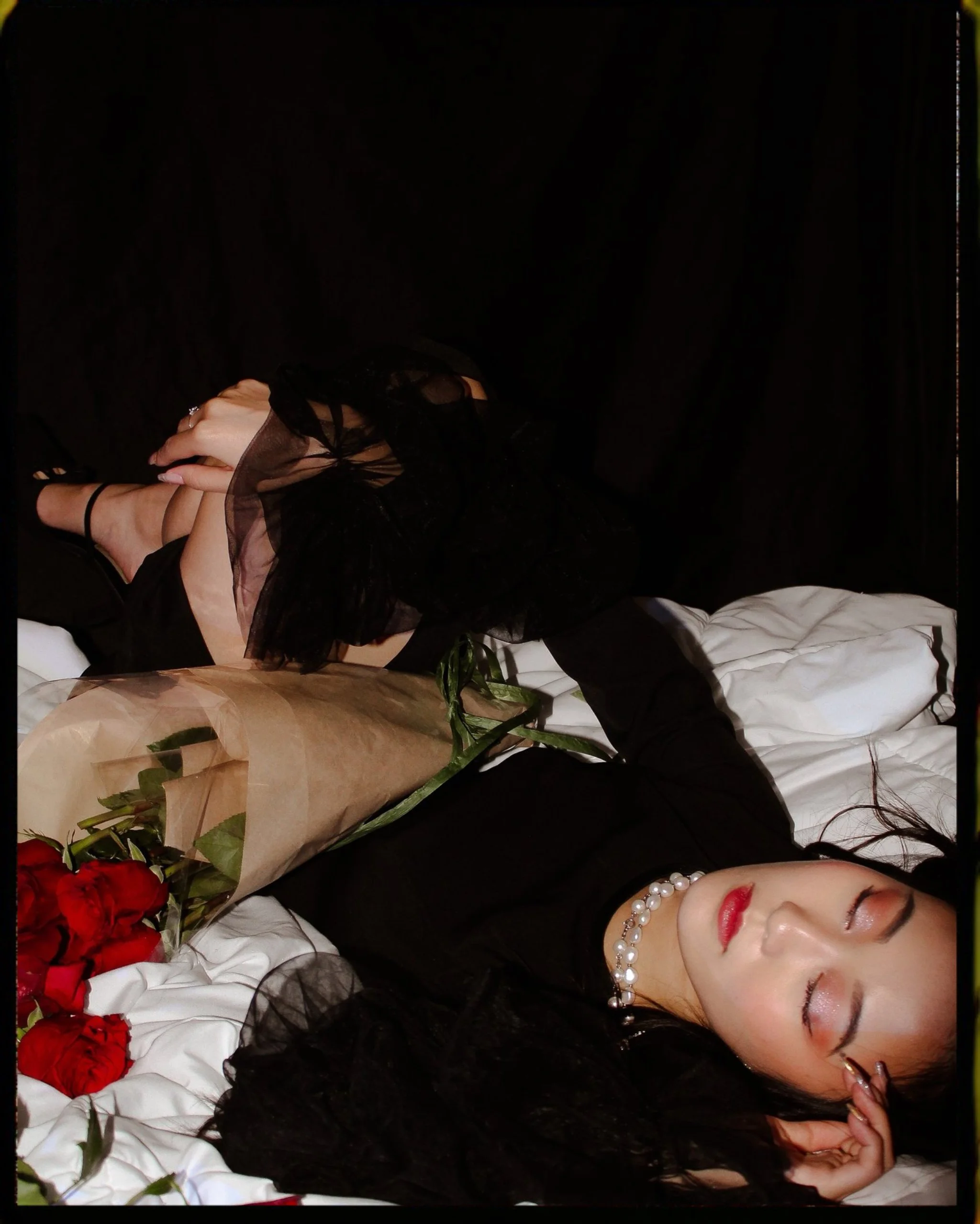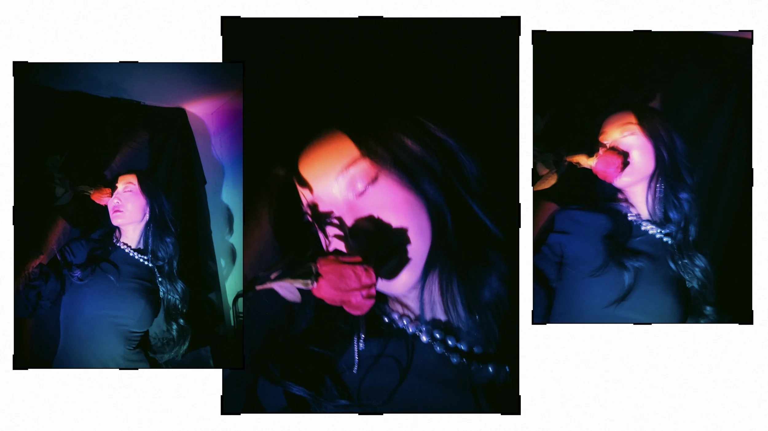 Your typical birthday shoot but not. Instead of renting a studio we decided to save money and shoot inside my bedroom. I put up black backdrops over my walls and used my white comforter to introduce dark romantic vibes to the atmosphere. I also decided to use different sources of light, the camera’s flash, a red lamp, and a tri color sun lamp to have more dynamic coloring and enhance the gothic sensual vibes. Sasha brought roses and cake to use as props(the cake she ate later) but the roses fully completed the charming and intimate mood balanced perfectly with her bold red lip and black dress. We channeled many different vibes in this shoot, of course the traditional celebratory birthday shots but also whimsical lover and sad tumblr girl. It was interesting to see how many different shots could be captured in the same small space with limited materials.